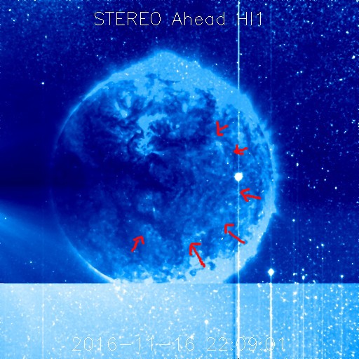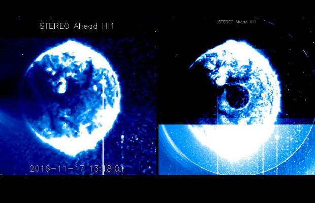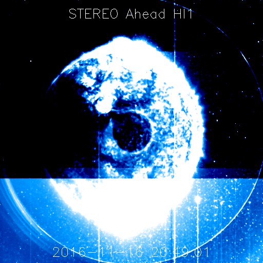 Le immagini di STEREO vengono create con un gran numero di esposizioni sommate tra loro. In questo caso, la sfera visibile nelle immagini del 17 novembre non è altro che un’immagine del Sole sovrapposta a quelle normalmente prodotte dallo strumento Ahead HI1.