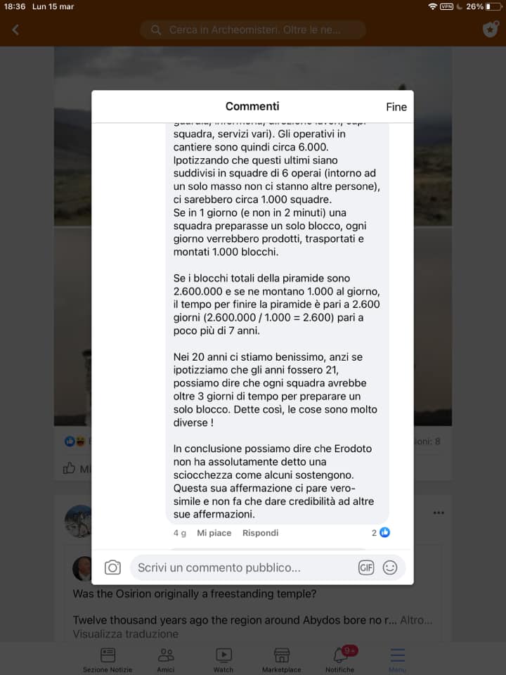 leggo con interesse la produzione di un blocco di pietra a 1:04 minuti, tagliarla più o meno regolarmente, e trasportarla su, sempre mantenendo la struttura generale esente da errori (che porterebbe a dover riportare giù non solo il singolo blocco ma anche la struttura sovrastante il blocco inserito erroneamente) e' ovvio che sarebbe una produzione sovraumana in tutti i sensi, anche calcolando le 16 ore al giorno, con turni di riposo, cambio di squadre, costruzione camere interne ecc ecc e i 20 anni di cui Erodoto parla.