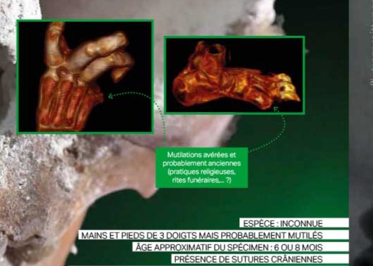 Nell'insieme pare comunque disfunzionale, manca di simmetria e le tre dita della mummia di Nazca della foto seguente sono effetto di amputazione, il che getta un'ombra sull'intera questione e rende plausibile l'ipotesi … torta.
