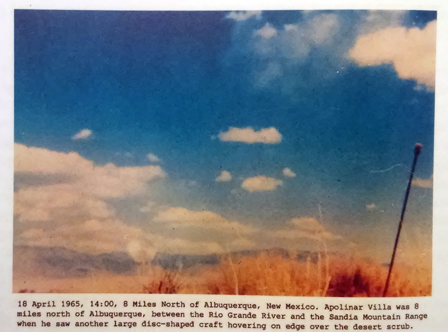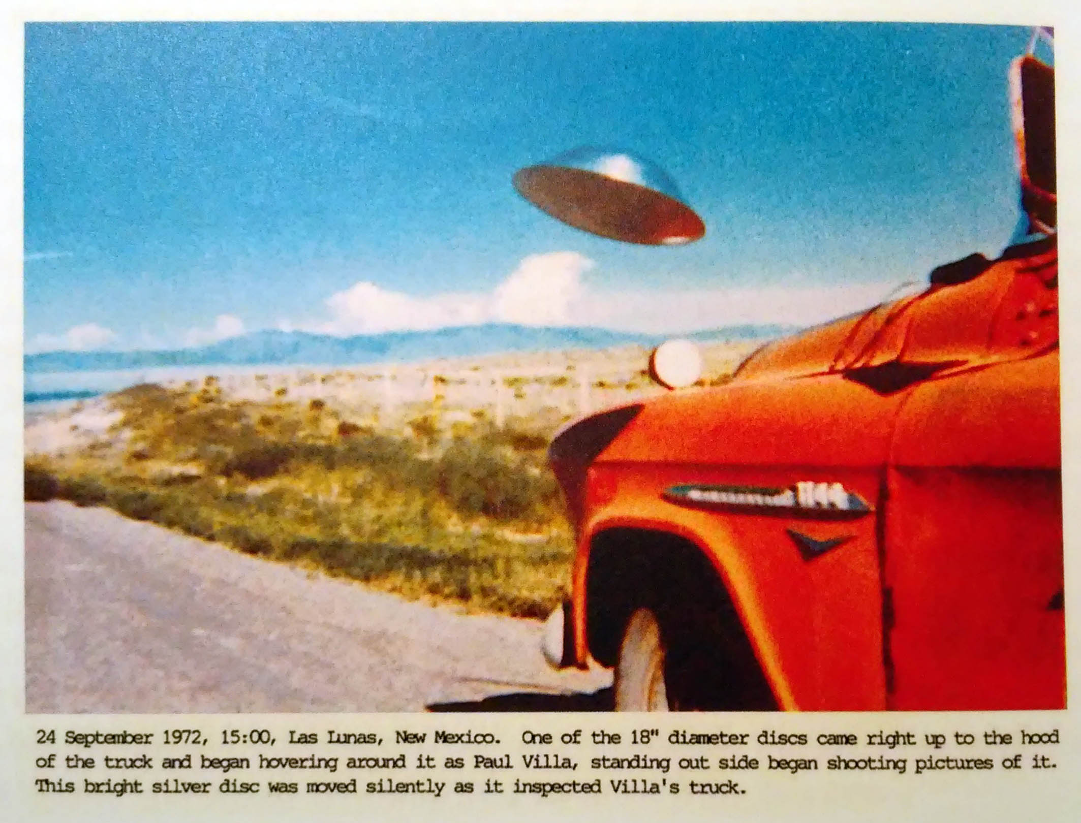 Un dettaglio che può forse restituire un tratto della personalità di Villa. Nella relazione dell'avvistamento del settembre 1972 (quello con il camioncino rosso/arancione), WS scrive: "At about 15:00 in the afternoon of 24 September 1972, Mr. A.V. (declines identification), a truck farmer in Las Lunas, was returning to town from dumping a load of waste at a sand fill scans 15 miles west, when he became involved in a strange event. ecc" ("sand fill" è riempimento di sabbia, "sand fill scans" non so, ma potrebbe essere landfillscans, cioè discariche). Perchè Apolinar Villa "A.P.", definito genericamente "a truck farmer" ha rifiutato l'identificazione "declines identification", nel riferire i dettagli dell'avvistamento di quella giornata? Riservatezza, ... o magari perché aveva scaricato rifiuti dove non doveva ... [:246]