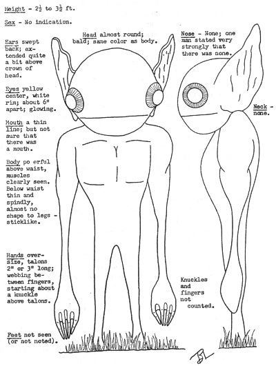 La creatura era luminosa, e quando fu abbastanza vicina, i due testimoni poterono osservarla nei minimi particolari: aveva occhi giallastri dalle orbite molto grandi, una bocca lunga e sottile, orecchie elefantesche, la testa grossa, petto all’apparenza metallizzato, gambe esili come le braccia, che toccavano quasi terra se distese in giù, e le mani che finivano con degli artigli. Incredibile!