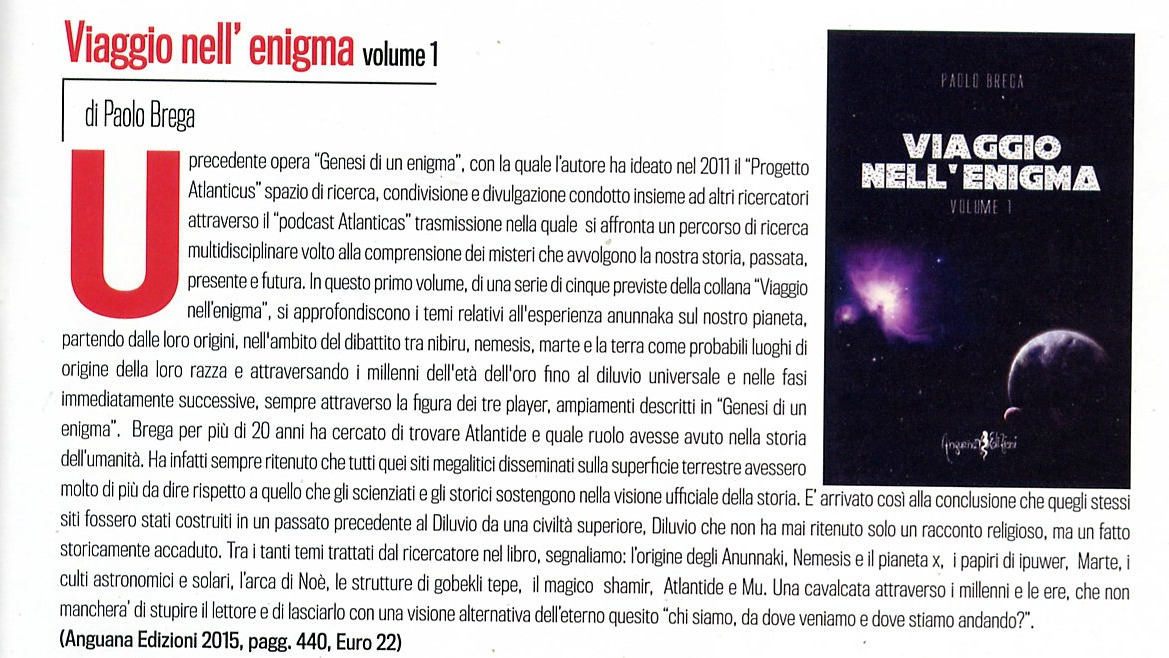 Ma volevo comunicare a tutti gli amici del Progetto Atlanticus che il libro "Viaggio nell'Enigma - vol.1" è stato recensito sul numero di Dicembre della rivista "Enigmi" e cogliere così l'occasione per ringraziare nuovamente tutti coloro incontrati 'lungo la strada' che con il loro sostegno hanno reso possibile tutto questo.