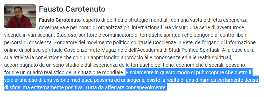 Da tanti anni di avventurose esperienze professionali come analista politico e intelligence per governi e strutture multilaterali, e poi da una serie di attivitá politiche e di affari in vari paesi del mondo. Spesso a contatto ravvicinato ed in scontro diretto con forti poteri oscuri. Ed infine da una intensa e libera ricerca spirituale, che ha fornito lo strumento per una più autentica comprensione delle vicende nazionali ed internazionali.