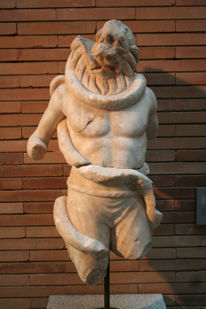 From each hand a snake is hanging, one of which holds his head over a krater, the other over a small burning altar, which are standing on either side of the god. Creeping up to the altar is a third and bigger snake, coming from between the teeth of Aion' s mouth.