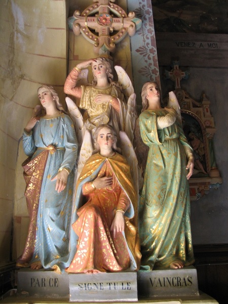 Acquasantiera – Rennes le ChâteauAlla base sulla quale gli Angeli stanno vi è la scritta “Par ce signe tu le vaincras”, in chiaro riferimento al segno della Croce.