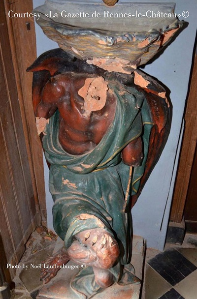 Volta d’ingresso della chiesa – Rennes le ChâteauL’atto vandalico dell’aprile 2017Il 23 Aprile 2017, per la seconda volta in poco più di vent’anni, la statua di Asmodeo viene nuovamente vandalizzata assieme al bassorilievo di Maria Maddalena.