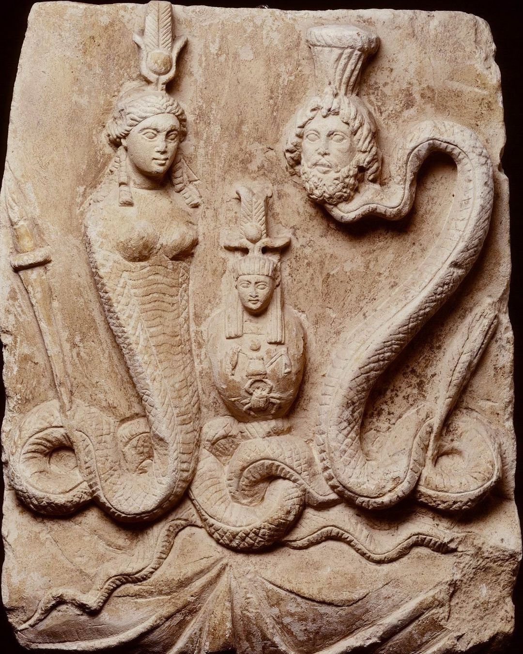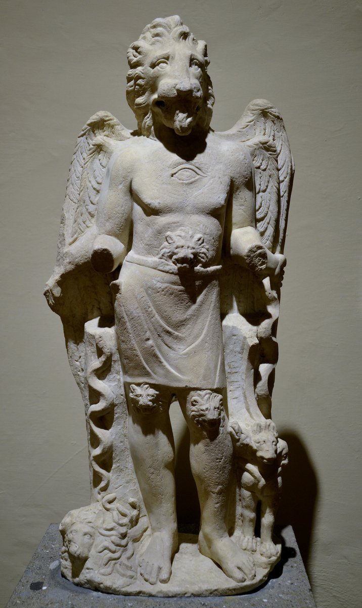 Standing Aion before a throne. His body is covered with a loin-cloth only. He has a lion's head and four wings are attached to his shoulders. On his breast an eye, on stomach and knees lion's heads. He has four arms, the hands of which are broken off. In one hand a sceptre. Beside his feet a hydra and a horned(?) lion's head (r) and a sitting three,headed Cerberus (l). On either side a trunk entwined by a serpent. The left one is crawling upwards, the other lays its head above that of the Cerberus, consisting of a dog's, a lion's and ram's head.