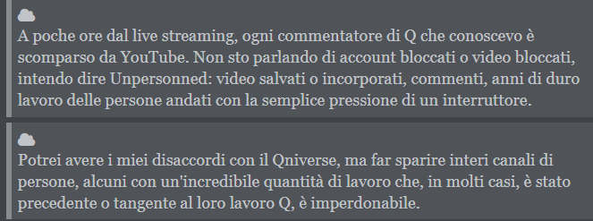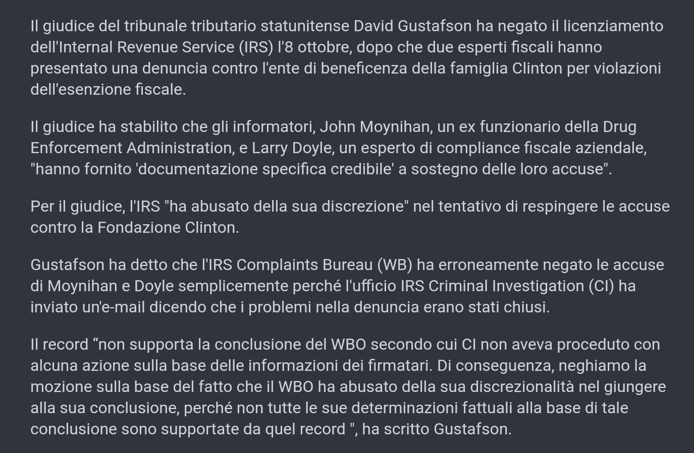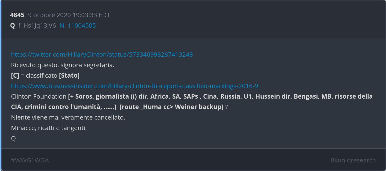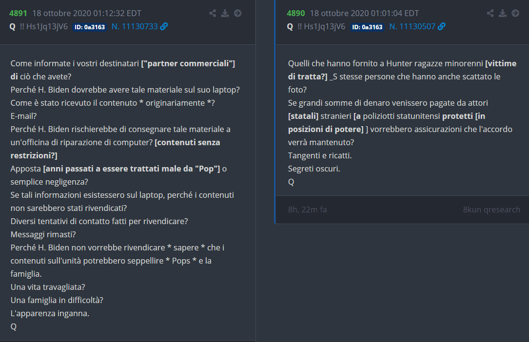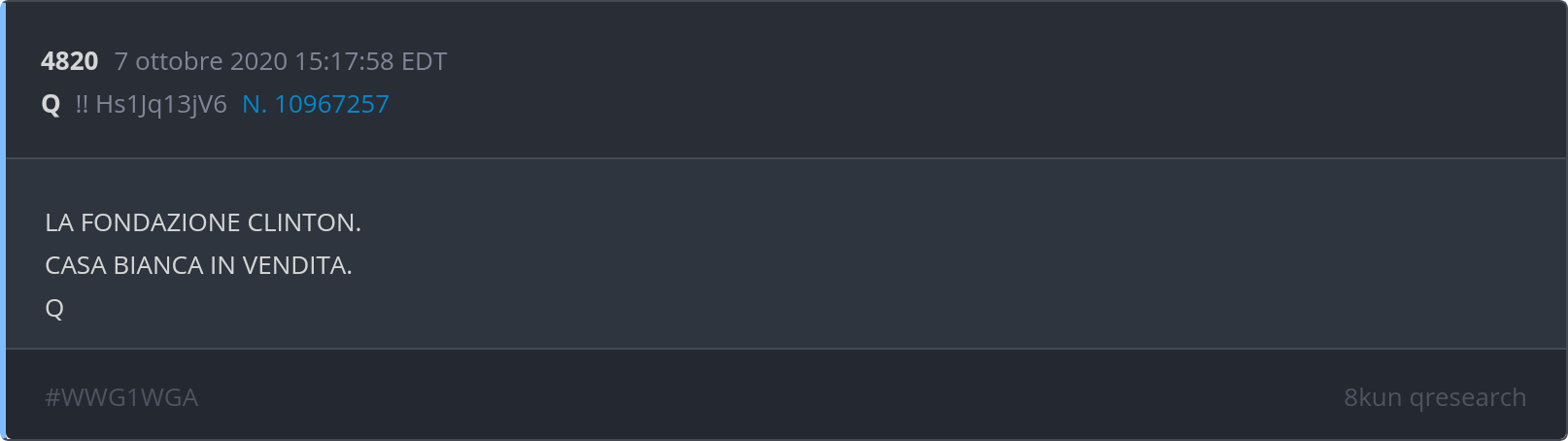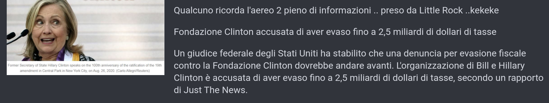 [33] https://youtu.be/f_VQ0CP2S5U [34] https://youtu.be/9LuSpHJNPe0 [35] https://nypost.com/2020/10/16/texts-show-raw-intimate-exchange-between-joe-and-hunter-biden/[36] https://nypost.com/2020/10/16/hunter-biden-email-detailing-chinese-ties-confirmed-by-source-report/[37] https://nypost.com/2020/10/16/twitter-still-holding-the-posts-account-hostage-over-hunter-biden-links/[38] http://www.atlanticoquotidiano.it/rubriche/esplosivo-il-russiagate-un-piano-orchestrato-dalla-clinton-per-screditare-trump-e-obama-sapeva/ [39] https://www.thedenverchannel.com/news/election-2020/we-are-getting-them-out-secretary-of-state-mike-pompeo-to-release-more-hilary-clinton-emails [40] https://www.reuters.com/article/us-usa-congress-conspiracy-idUSKBN26N372 [41] https://welovetrump.com/2020/09/30/caught-did-biden-wear-a-wire-during-the-debate/ [42] https://www.independent.co.uk/news/world/americas/us-election/joe-biden-debate-inshallah-twitter-b724255.html[43] https://americantruthproject.org/u-s-government-infiltrated-by-muslim-brotherhood/ [44] https://thehill.com/blogs/pundits-blog/presidential-campaign/292310-huma-abedins-ties-to-the-muslim-brotherhood [45] https://www.newsweek.com/66-percent-spanish-speaking-americans-telemundo-poll-think-trump-just-won-debate-1535176[46] https://www.axios.com/trump-qanon-nbc-town-hall-2020-038af269-694d-48ae-b74c-7f1a2980a147.html[47] https://www.cbsnews.com/news/taliban-on-trump-we-hope-he-will-win-the-election-withdraw-us-troops/ [48] https://www.newsweek.com/vladimir-putin-says-wants-work-joe-biden-claims-shared-values-between-democrats-communism-1537501 [49] https://www.controinformazione.info/lesercito-russo-ha-bloccato-il-libero-accesso-allo-stretto-di-kerch-e-allintera-parte-della-costa-del-mar-nero/ [50] https://www.ansa.it/sito/notizie/mondo/europa/2020/10/12/nave-turca-oruc-reis-torna-nellegeo_ca27899f-093f-486a-9c72-62b3aaa7185b.html [51] https://www.open.online/2020/10/12/corea-del-nord-kim-jong-un-piange-durante-una-cerimonia-pubblica-e-si-scusa-per-i-suoi-errori-il-video/ NON CONSIDERATE QUELLO CHE AVETE LETTO COME VERO AL 100%, MA FATE LE VOSTRE RICERCHE E ARRIVATE ALLE VOSTRE CONCLUSIONI. SCAVATE IN CERCA DELLA VERITÀ. NON È PIÙ TEMPO DI ACCONTENTARSI DI "VERITÀ" PRECONFEZIONATE DA ALTRI. TORNA A: PARTE QUATTORDICESIMA / 3 GLI ALTRI POST DELLA SERIE:ELENCO E LINK DEI POSTpublicpublicdomaincco