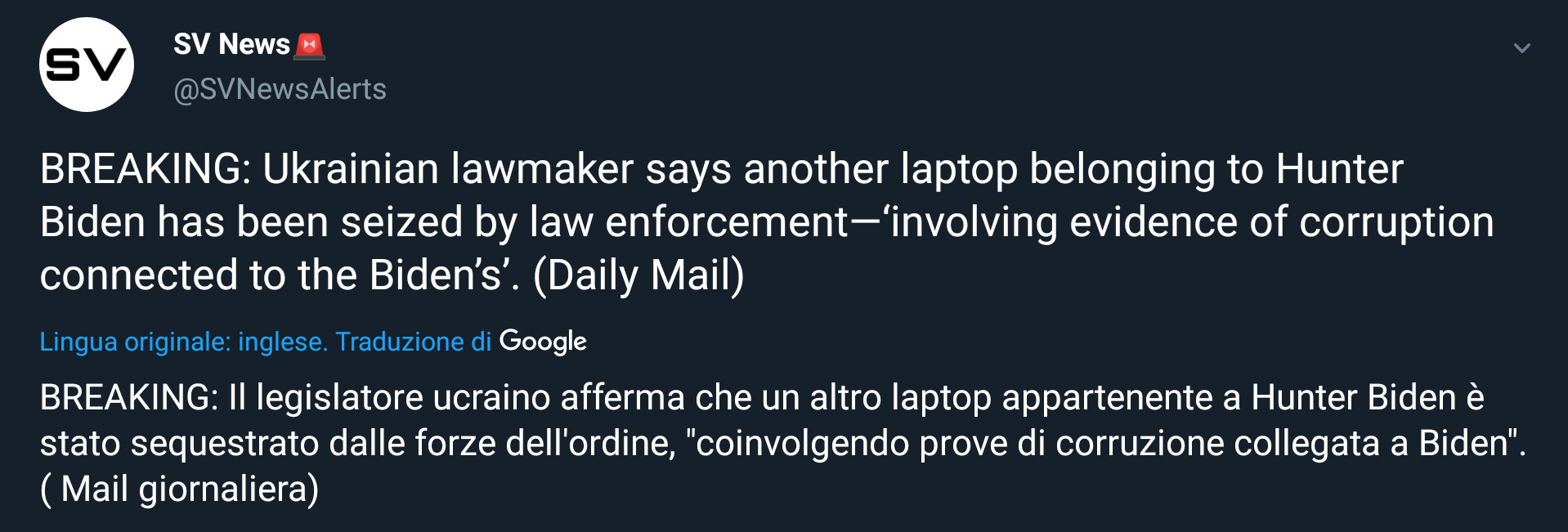 October Surprise che stiamo per esporre è però, nell’immediato, ancora più grossa. Qualche anno fa Hunter Biden, figlio di Joe Biden, portò alcuni computer a riparare e li dimenticò in negozio, senza mai più ritirarli. In base al contratto da lui firmato, i computer diventarono, dopo un certo tempo, di proprietà negoziante, che ne esaminò il contenuto. Avendo trovato materiale relativo ad atti illegali, prima si rivolse all'FBI e poi pensò di consegnarlo all’avvocato di Rudy Giuliani, ex sindaco di New York e collaboratore di Trump. Per farla breve, i documenti recuperati sui computer sono di indubitabile autenticità, di provenienza lecita e altamente compromettenti