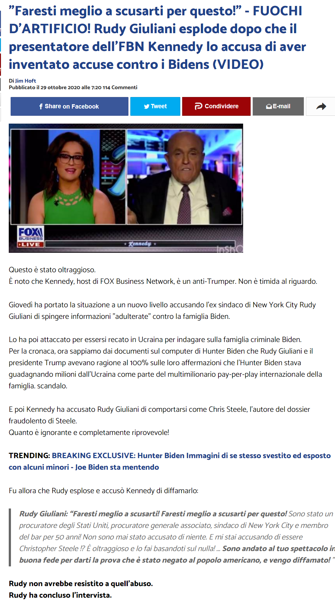 La causa precipitante (ma non solo) è che The Intercept sta tentando di censurare i miei articoli in violazione sia del mio contratto che dei principi fondamentali della libertà editoriale. L'esempio più recente e forse il più eclatante è una colonna di opinione che ho scritto questa settimana che, cinque giorni prima delle elezioni presidenziali, critica Joe Biden, il candidato che sembra essere vigorosamente sostenuto da tutti i redattori di Intercept a New York che stanno imponendo la censura e il rifiuto di pubblicare l'articolo a meno che non acconsenta a rimuovere tutte le sezioni critiche del candidato che vogliono vincere. Tutto ciò viola il diritto nel mio contratto con FLM di pubblicare articoli senza interferenze editoriali tranne in circostanze molto ristrette che chiaramente non si applicano qui.
