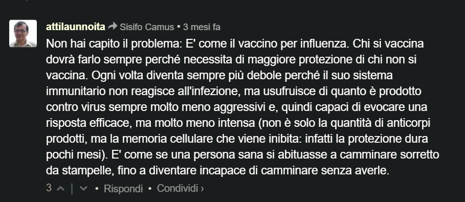 Ebbene, analogamente alle regole che si applicano ai classici antibiotici antimicrobici, è fondamentale che i nostri “antibiotici antivirali” autocostruiti siano messi a disposizione in una concentrazione sufficiente e adattati alle caratteristiche specifiche del nostro nemico. Questo è il motivo per cui in caso di malattia batterica è fondamentale non solo scegliere il giusto tipo di antibiotico (in base ai risultati di un antibiogramma) ma anche prenderlo abbastanza a lungo (secondo la prescrizione). Il mancato rispetto di questi requisiti rischia di garantire ai microbi la possibilità di sopravvivere e, quindi, può far progredire la malattia. Un meccanismo molto simile può applicarsi anche ai virus, in particolare ai virus che possono mutare facilmente e rapidamente (come, ad esempio, il caso dei Coronavirus); quando la pressione esercitata dall’esercito (leggi: la difesa immunitaria della popolazione inizia a minacciare la replicazione e la trasmissione virale, il virus assumerà un altro strato in modo che non possa più essere facilmente riconosciuto e, quindi, attaccato dal sistema immunitario ospite. Il virus è ora in grado di sfuggire all’immunità (cosiddetta: “fuga immunitaria”). Tuttavia, il virus può fare affidamento su questa strategia solo a condizione che abbia ancora spazio sufficiente per replicarsi. I virus, contrariamente alla maggior parte dei batteri, devono fare affidamento su cellule ospiti viventi per replicarsi. Questo è il motivo per cui il verificarsi di “mutanti di fuga” non è troppo preoccupante fintanto che la probabilità che queste varianti trovino rapidamente un altro ospite è piuttosto remota. Tuttavia, questo non è particolarmente vero durante una pandemia virale! Durante una pandemia, il virus si sta diffondendo in tutto il mondo con molti soggetti che perdono e trasmettono il virus (inclusi anche i “portatori” asintomatici). Maggiore è la carica virale, maggiore è la probabilità che il virus si imbatta in soggetti che non sono stati ancora infettati o che sono stati infettati ma non hanno sviluppato sintomi. A meno che non siano sufficientemente protetti dalla loro difesa immunitaria innata (attraverso gli addominali naturali), contrarranno la malattia da Covid-19 poiché non possono fare affidamento su altri addominali, cioè acquisiti. È stato ampiamente riportato, infatti, che l’aumento degli Abs specifici per S (spike) nelle persone con infezione sintomatica è piuttosto limitato e di breve durata. Inoltre, questi Abs non hanno raggiunto la piena maturità. La combinazione di infezione virale su uno sfondo di maturità e concentrazione di Ab non ottimali consente al virus di selezionare mutazioni che gli consentono di sfuggire alla pressione immunitaria. La selezione di queste mutazioni avviene preferibilmente nella proteina S poiché questa è la proteina virale responsabile dell’infezione virale. Poiché le mutazioni selezionate conferiscono al virus una maggiore capacità infettiva, ora diventa molto più facile per il virus causare malattie gravi nei soggetti infetti. Più persone sviluppano una malattia sintomatica, meglio il virus può garantire la sua propagazione e perpetuazione (le persone che contraggono una malattia grave diffonderanno più virus e per un periodo di tempo più lungo rispetto ai soggetti infetti asintomaticamente). Sfortunatamente, l’aumento di breve durata degli addominali specifici per S, tuttavia, è sufficiente per bypassare gli addominali innati / naturali delle persone. Quelli vengono messi fuori mercato poiché la loro affinità per S è inferiore all’affinità degli Abs specifici per S. Questo per dire che con un aumento del tasso di infezione nella popolazione, il numero di soggetti che si infettano mentre sperimentano un momentaneo aumento degli addominali S-specifc aumenterà costantemente. Di conseguenza, il numero di soggetti che vengono infettati mentre sperimentano una momentanea diminuzione della loro immunità innata aumenterà. Di conseguenza, un numero sempre crescente di soggetti diventerà più suscettibile a contrarre una malattia grave invece di mostrare solo sintomi lievi (cioè limitati al tratto respiratorio superiore) o nessun sintomo. Durante una pandemia, soprattutto i giovani saranno colpiti da questa evoluzione poiché i loro addominali naturali non sono ancora in gran parte soppressi da una panoplia di addominali “acquisiti”, antigene-specifici. Addominali naturali, e l’immunità naturale in generale, svolgono un ruolo fondamentale nel proteggerci dagli agenti patogeni in quanto costituiscono la nostra prima linea di difesa immunitaria. A differenza dell’immunità acquisita, le risposte immunitarie innate proteggono da un ampio spettro di agenti patogeni (quindi non compromettere o sacrificare la tua difesa immunitaria innata!). Poiché gli Abs naturali e le cellule immunitarie innate riconoscono uno spettro diversificato di agenti estranei (cioè non auto) (solo alcuni dei quali hanno un potenziale patogeno), è importante, infatti, mantenerlo sufficientemente esposto alle sfide ambientali. Mantenendo il sistema immunitario innato (che purtroppo non ha memoria!) ADDESTRATO, possiamo resistere molto più facilmente ai germi che hanno un reale potenziale patogeno. Ad esempio, è stato segnalato e scientificamente dimostrato che l’esposizione ad altri.