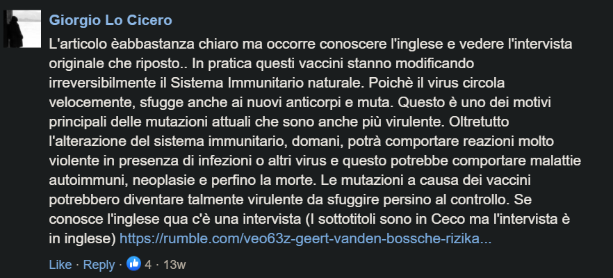 Vanden Bossche sostiene che l’umanità sta ora affrontando “una catastrofe globale senza eguali”, a causa dell’somministrazione di massa di quelli che considera i vaccini sbagliati.