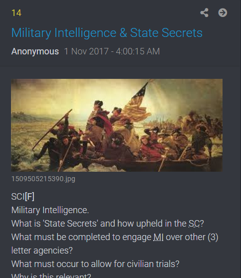 Concord. Altro riferimento di Q alla guerra d'indipendenza. https://it.wikipedia.org/wiki/Battaglia_di_Lexington leggetevi questo link e tenete bene a mente questo https://en.wikipedia.org/wiki/George_Wa ... ware_River e questo https://en.wikipedia.org/wiki/Durham_boat Q fà spesso riferimento a questo avvenimento con tanto di foto dell'epoca.