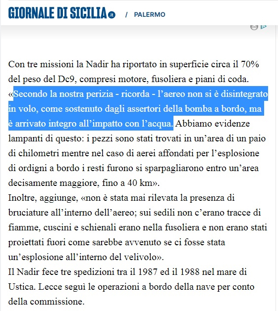 Inoltre, aggiunge, «non è stata mai rilevata la presenza di bruciature all’interno dell’aereo; sui sedili non c’erano tracce di fiamme, cuscini e schienali erano nella fusoliera e non erano stati proiettati fuori come sarebbe avvenuto se ci fosse stata un’esplosione all’interno del velivolo».