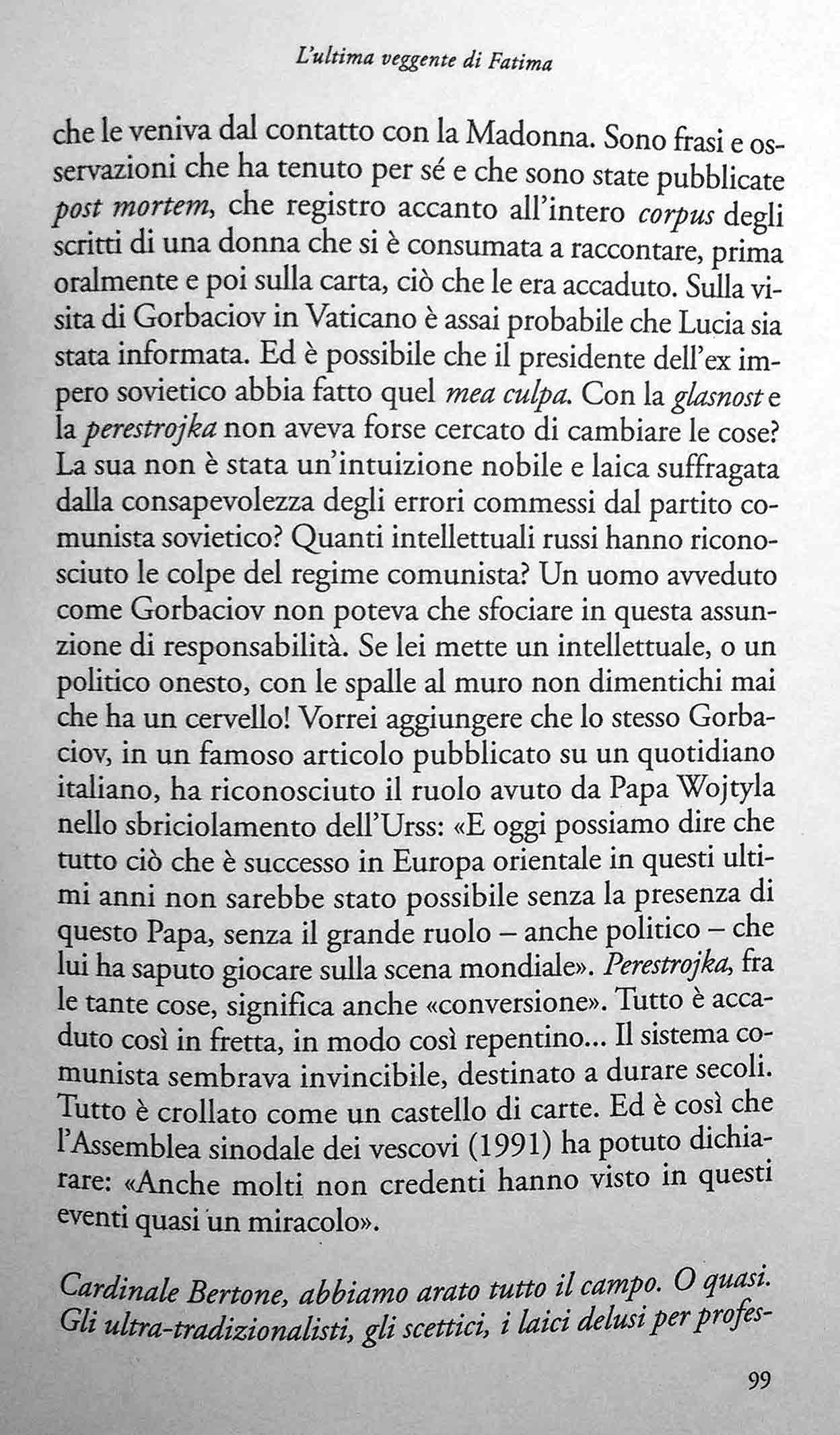 Ieri nello spostare alcuni libri mi sono imbattuto nel capitolo che qui allego in foto, tratto da "L'ultima veggente di Fatima. I miei colloqui con Suor Lucia", 2007.