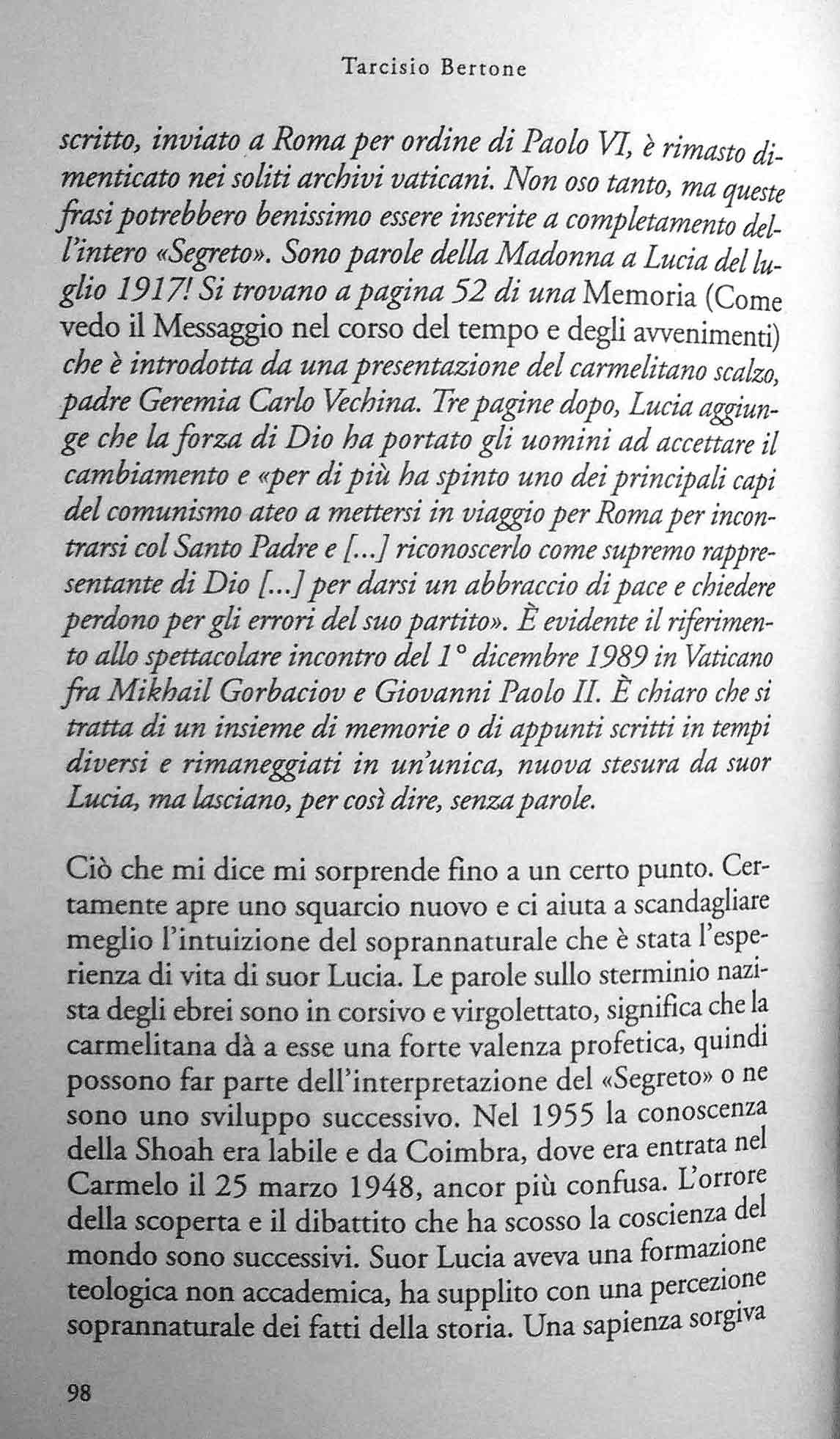 L'intervistatore, a colloquio con il Card. Bertone a Torriglia, ha rievocato gli incontri avuti con Suor Lucia.