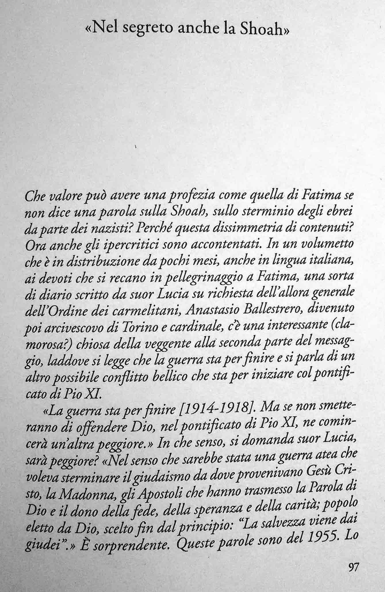 Lo dimostra quanto è accaduto a Solideo Paolini, il maggiore studioso italiano di Fatima che, viste le pagine di questo libro che gli ho inviato, ha scritto al Carmelo di Coimbra chiedendo di poter consultare le due opere inedite menzionate nel volume, ritenendo che lì vi siano ulteriori dettagli sulla parte secretata.