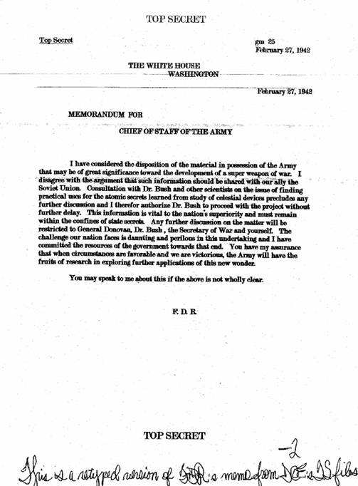 In questo memo il presidente Roosvelt scrive :” Ho considerato che la disponibilità del materiale in possesso dell’esercito possa essere di gran significato per lo sviluppo di una super arma bellica”… Consultate il dott. Bush ed altri scienziati sul problema di trovare usi pratici per i segreti atomici acquisiti dallo studio dei dispositivi celestiali”