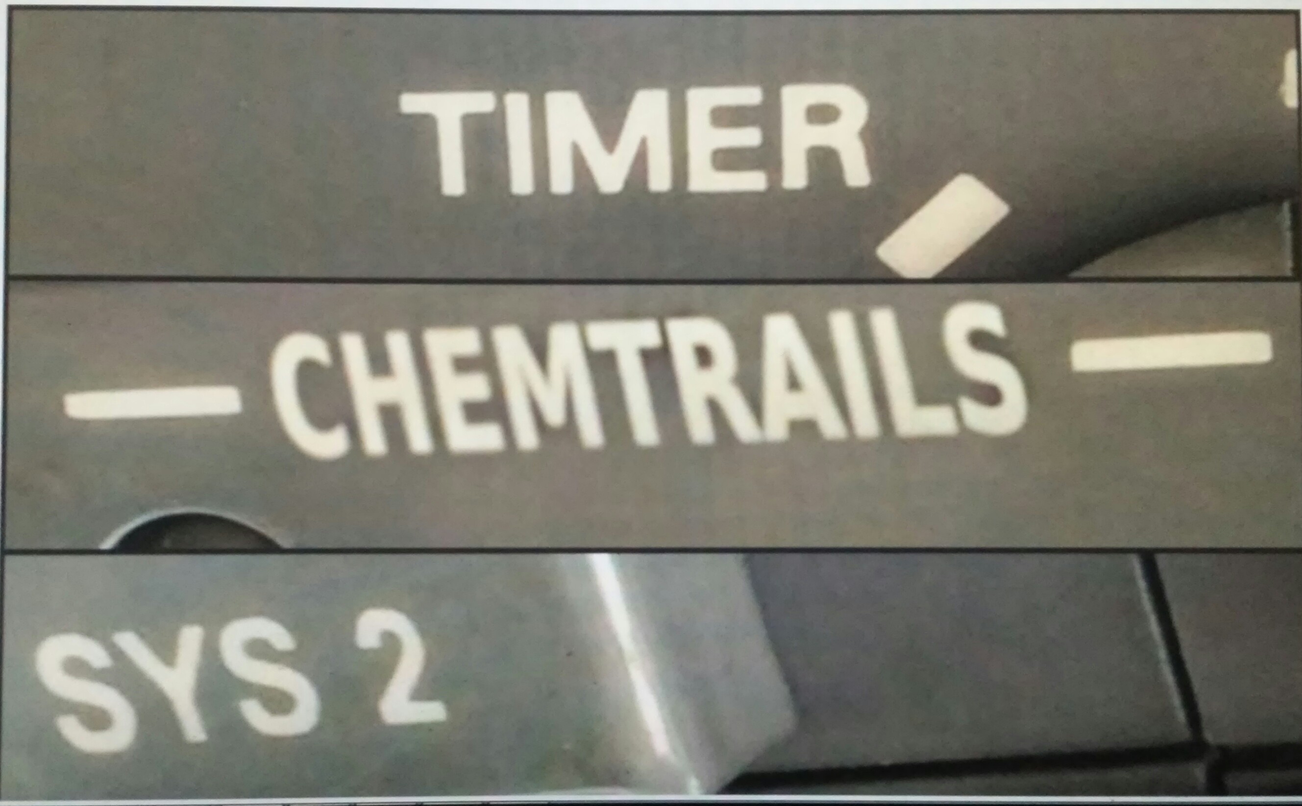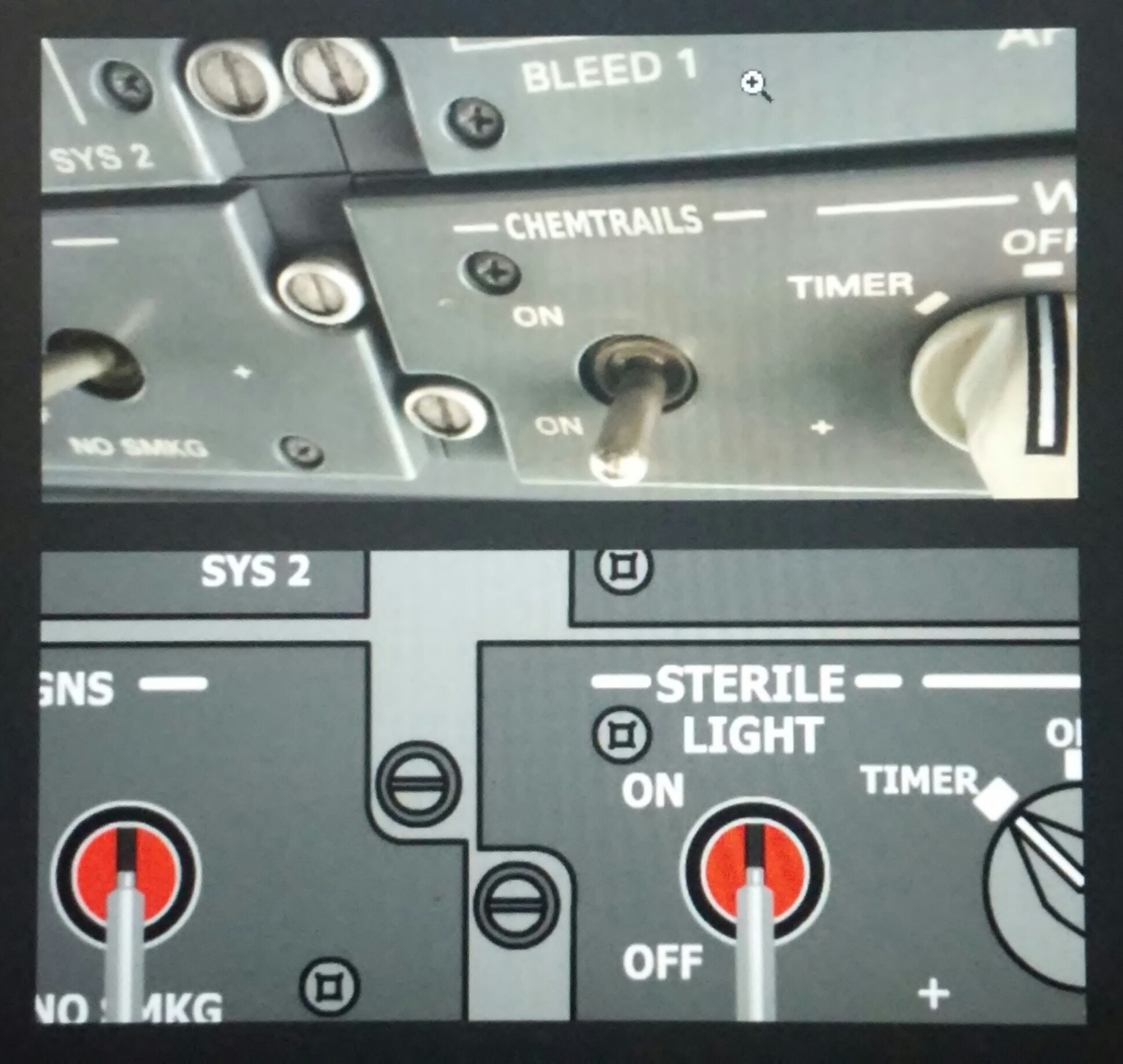 "Diversi commentatori sia sul thread Reddit che sul forum JetCareers hanno notato che l'immagine originale é stata presa da un pannello sopraelevato su un Embraer ERJ 145. Un diagramma di questo pannello dalla study guide EMB 145 mostra la stessa configurazione del pannello sopra- foto visualizzata, solo l '"interruttore scie chimiche" Embraer ERJ 145 é contrassegnato come un interruttore "Luce sterile":"