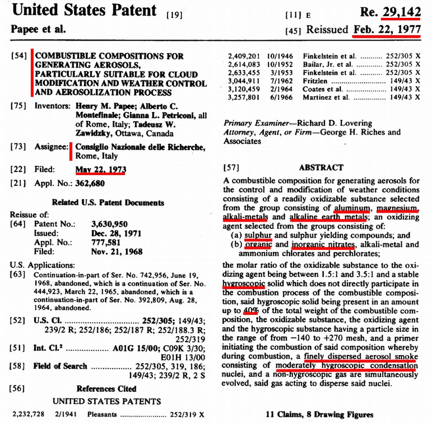 "E' possibile modificare le condizioni meteorologiche e manipolare i cicli pluviometrici, intervenendo sulle nubi tramite l'impiego di carburanti idonei? La risposta è affermativa. A titolo di esempio, vi proponiamo un brevetto risalente al lontano 1973 e nel 1977 assegnato al Consiglio Nazionale per le ricerche (C.N.R.). Nel testo è spiegato in modo approfondito com'è possibile alterare la composizione del combustibile al fine di abbattere l'umidità atmosferica e dissolvere le formazioni nuvolose che potrebbero causare precipitazioni piovose. Ciò è possibile additivando alluminio, magnesio ed altri elementi alcalini che, reagendo con i solfuri di scarto, derivanti dalla combustione, determinano una fine miscela di nanopolveri igroscopiche. E' quindi evidente com'è vantaggiosa ed economica la collaborazione delle compagnie civili, giacché la capillarità delle rotte commerciali permette di intervenire ovunque si intenda distruggere o deviare intere perturbazioni".