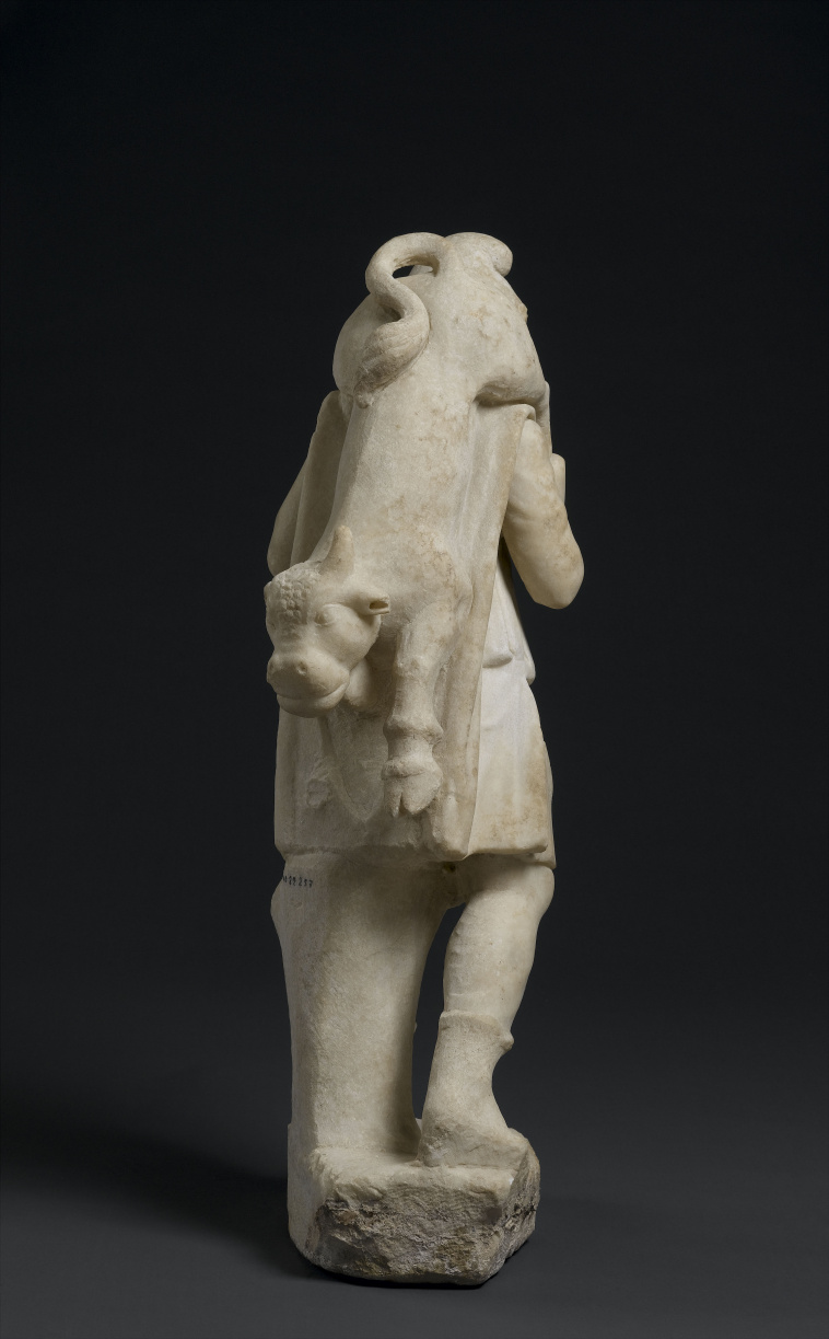 Dal momento che secondo la sua natura solo il suo aspetto rivolto agli umani era manifesto — la manifestazione visibile del dio del cielo — era detto che fosse di quest'ultimo il “figlio unigenito”, ma nondimeno era eguagliato al suo padre celeste, l'organizzatore e regolatore delle stagioni. Come tale era raffigurato con la testa di un leone e circondato da un serpente con la sua testa che giace sulla testa del dio — apparendo così a due teste. [71] Assieme all'introduzione dell'Ercole di Tiro, la religione mitraica adottò allo stesso tempo anche il simbolo di quest'ultimo della colonna di pietra, e Mitra, il dio-roccia, appare come il dio pilastro che regge il cielo oppure come un pilastro del cielo, s
