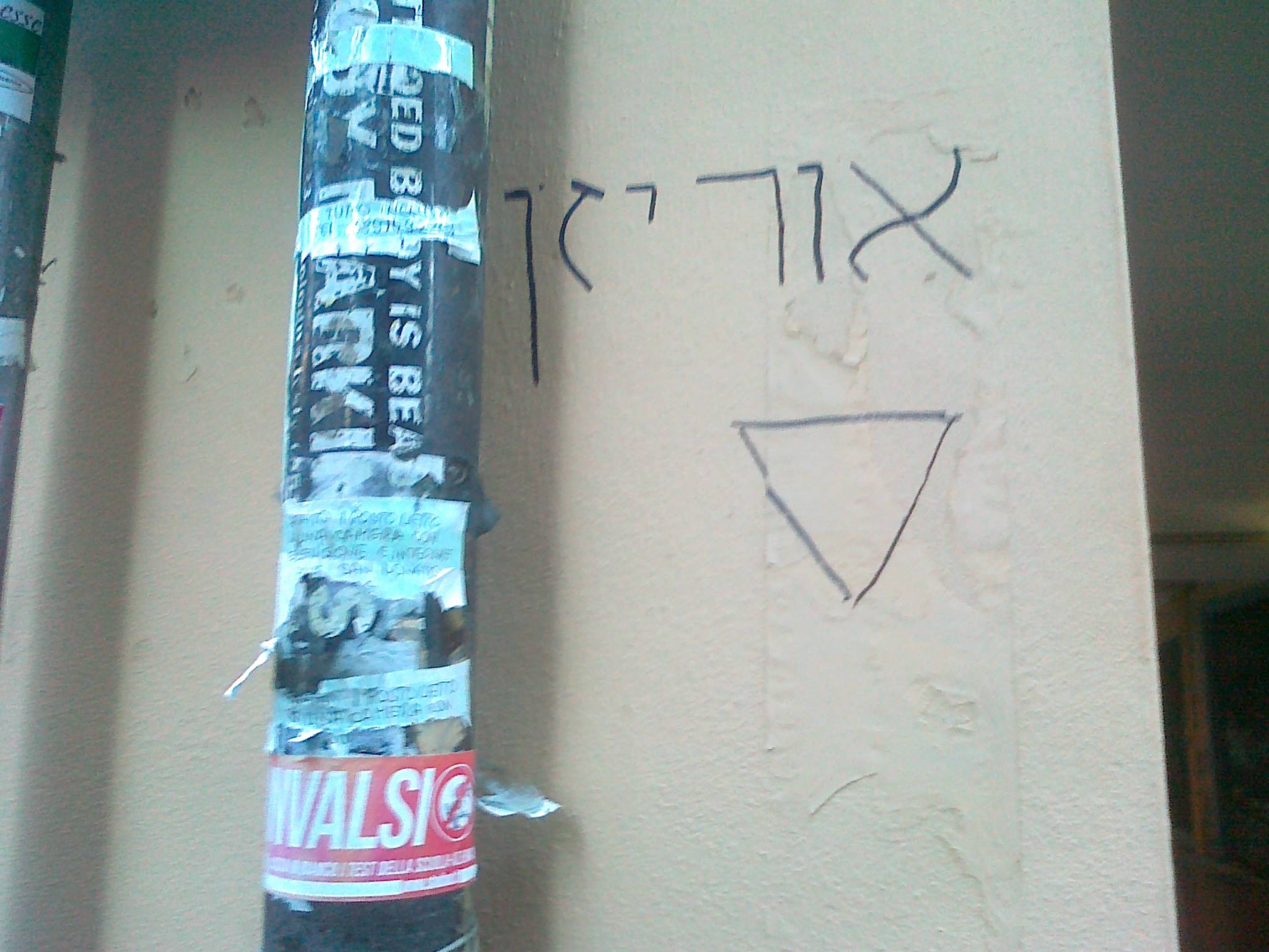 che porta al primo piano , in alto a sinistra salendo . Scrissi questa cosa con una vernice rosso sangue con il pennello