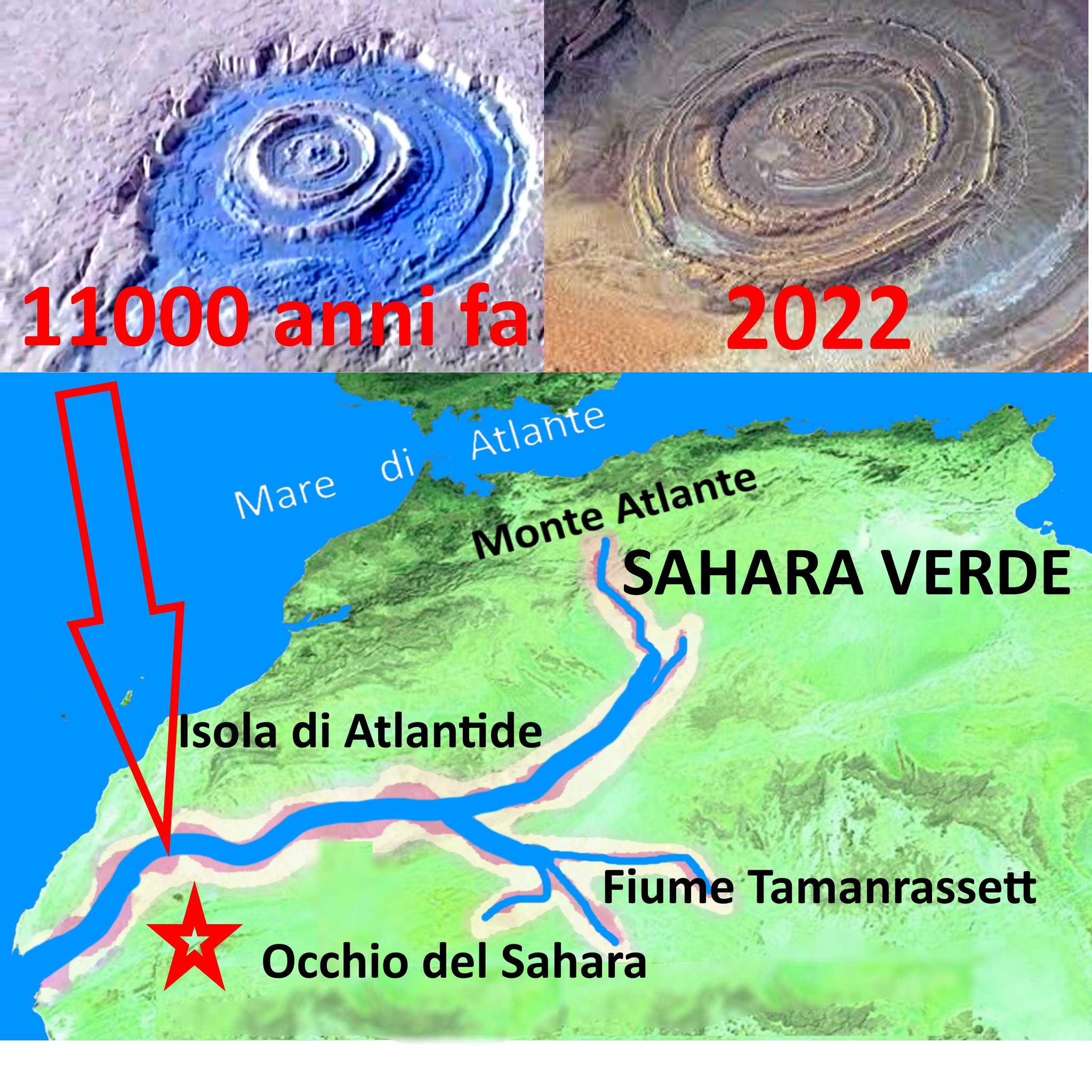 Platone afferma che questa struttura circolare si trovava in una grande isola, ed era poco distante da qualcosa che sembrava essere per ampiezza “un piccolo mare”. Ebbene, alcuni anni fa, grazie ai satelliti, gli scienziati hanno scoperto che 11.000 anni fa il Nord Africa era tagliato in due da un fiume gigantesco, il Tamanrasset, che aveva una foce ampia 400 km, e che era ampio in alcuni punti anche 90 km. Questo “piccolo mare” passava molto vicino all’ Occhio del Sahara. Inoltre, il suo percorso creava nel Nord Africa una “isola” molto più grande della Sicilia, della Corsica e della Sardegna messe insieme. Quindi, anche questo dettaglio descritto da Platone è, dal punto di vista geografico, assolutamente preciso..