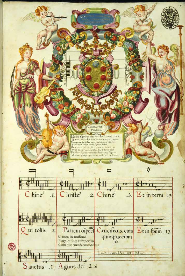 BML Med. Pal. 6 c.1r Costanzo Porta, Missa ducalis. Gimignano, i manoscritti che Mattia Lupi, letterato, studioso di musica e sacerdote aveva legato alla biblioteca della sua città e che fece trasferire a Firenze (Fantoni, 1993). Un piccolo nucleo di codici greci furono acquistati da Antonio Eparco, corfiriota di nobili origini e copista lui stesso: dai documenti risulta che nel 1566 Cosimo comprò da lui tutti i manoscritti di cui era in possesso, per una spesa di 390 ducati (La Biblioteca Medicea-Laurenziana, 1971, p. 34). Un numero imprecisato di manoscritti proviene dalla biblioteca di San Marco: un passaggio documentato soltanto dalle poche note di provenienza presenti ancora sulle carte di guardia dei codici. Probabilmente il nucleo più cospicuo è quello che era appartenuto alla biblioteca della Basilica di San Lorenzo. Dal momento del ritorno della collezione da Roma, la biblioteca medicea e la biblioteca della basilica convivono. Le casse contenenti i manoscritti erano state depositate nel refettorio di San Lorenzo nel 1527, erano state aperte e abbiamo notizia di consultazione dei codici in quegli anni. È infatti molto probabile, tenendo conto di notizie reperite nei documenti dell’Archivio di San Lorenzo, che le due collezioni si siano fuse in un lasso di tempo compreso fra il 1531 e il 1566. Probabilmente varie centinaia di volumi entrarono a far parte della biblioteca pubblica, se si pensa che solo la raccolta del canonico Antonio Petrei contava più di 500 volumi (Fantoni, 1993). L’indagine però ha permesso di individuare solo una parte di codici: la rilegatura a cui furono sottoposti per essere sistemati sui banchi michelangioleschi ha fatto perdere le antiche carte di guardia e quindi gran parte delle note di possesso e di provenienza. Oltre ai manoscritti acquisiti per la Biblioteca michelangiolesca, la Laurenziana conserva anche quelli personali di Cosimo I: alcuni fanno parte del Fondo Mediceo Palatino, quindi della biblioteca privata granducale, altri invece, secondo un progetto che non è possibile determinare, furono collocati nel fondo Plutei. Architetti, ingegneri, letterati gravitarono intorno alla corte medicea: tradussero testi classici, composero opere su commissione di Cosimo, e gli offrirono i loro scritti per ottenerne i favori. Fra i testi