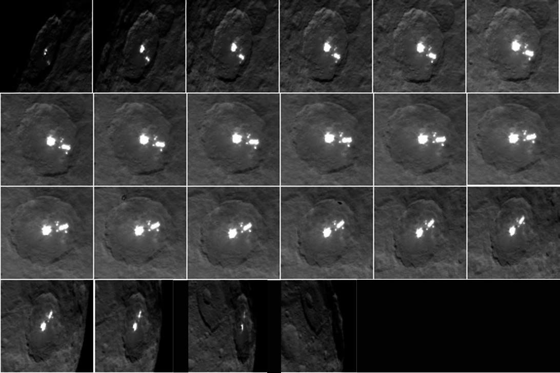 Una nuova sequenza per meglio risolvere l’enigma dei puntini luminosi sul pianeta nano Cerere. E’ quanto pensa la NASA che ha pubblicato una serie di immagini animate nel quale i punti luminosi sono ben visibile grazie alle foto scattate dalla sonda Dawn, missione per la quale l’INAF è uno dei partner. Le immagini sono state scattate da una distanza di 8400 miglia (13600 km).