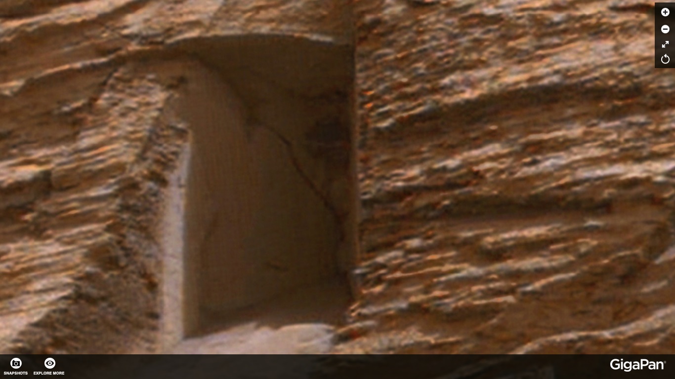 bellissima la foto gigapan, certo che ogni dettaglio può essere qualunque cosa...riguardo alla foto analizzata, sembra una fenditura naturale, anche perchè se usi un laser o strumenti di scavo e intaglio, potevano finire l'opera, tagliando bene anche la parte finale alla base, da me evidenziata nel circolo.