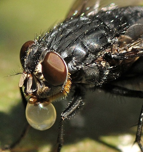 Calliphora vicina (ricordate la mosca del caso Rea?) fa esattamente la stessa cosa. Ovvero, le mosche volano e, entro un raggio di qualche chilometro, si posano su tutto. E le mosche si nutrono. Tra tante cose