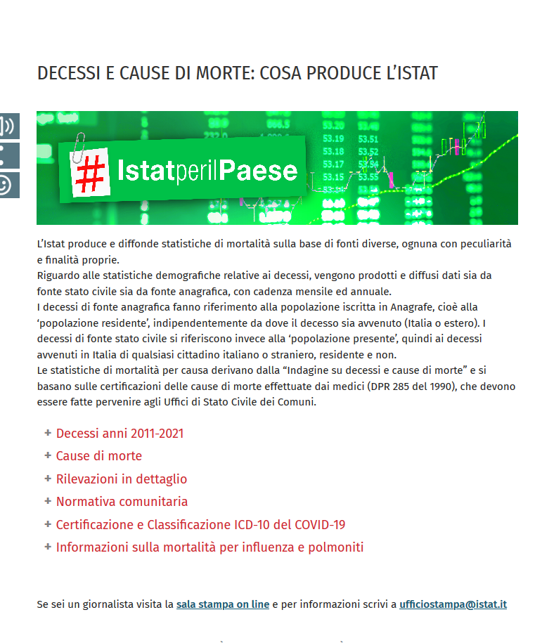 Contattati dalla redazione di Facta, i responsabili dell’Istituto nazionale di statistica hanno smentito i dati contenuti nel tweet, spiegando che «gli ultimi dati ufficiali sulle cause di morte rilasciati da Istat si riferiscono all’anno 2018» e che ogni altra proiezione successiva a quella data non può dunque essere stata prodotta da Istat.