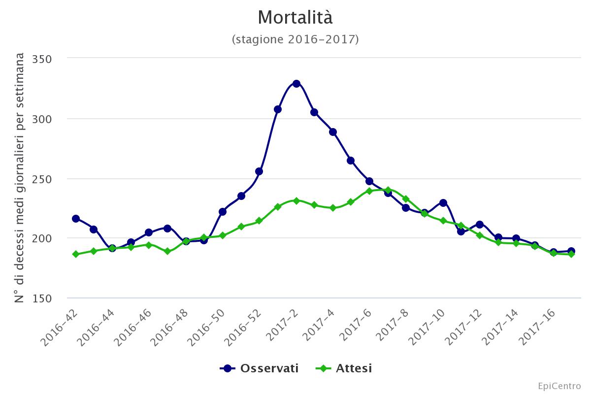Scostamento di circa 3'100 decessi sulla media attesa per tutto il periodo di 11 settimane del picco influenzale.