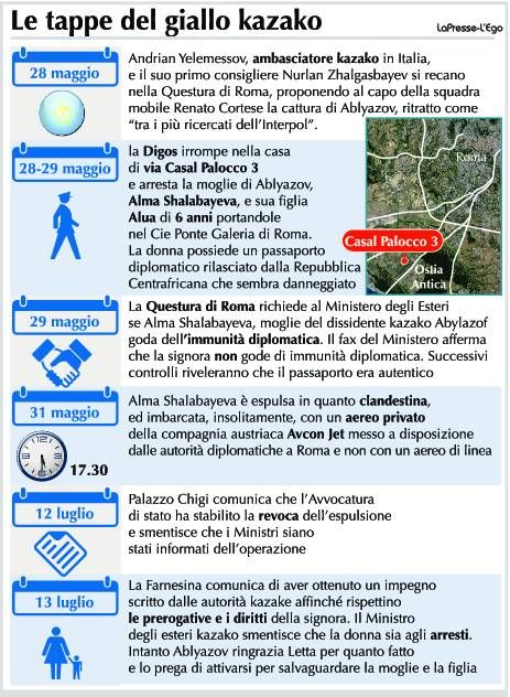 Informazione del Ministero degli Affari Esteri della Repubblica del Kazakhstan Noi sappiamo che nella notte tra il 27 e il 28 maggio di quest’anno, le forze dell’ordine italiane hanno svolto le attività di cattura del ricercato Mukhtar Ablyazov presso il suo presunto domicilio alla periferia di Roma dove è stata identificata la sua moglie – Shalabayeva Alma e la figlia di sei anni Alua.