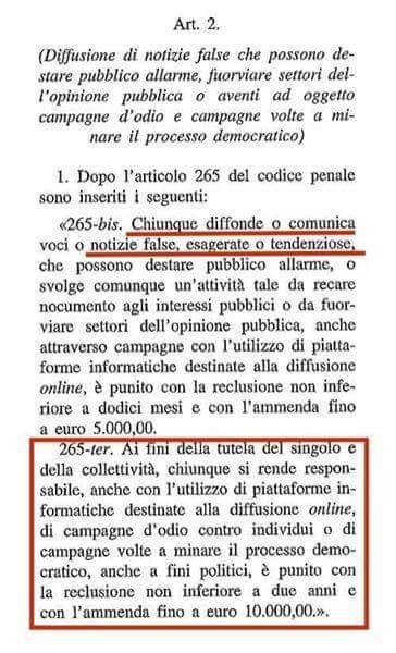 sottovento ha scritto:In verità c'è da dire una cosa prendendo ad esempio le discussioni di questo (ottimo) forum. Noi generalmente riportiamo notizie dei giornali on line e le discutiamo. In ciò quindi non commetteremmo nessun reato previsto nel Ddl in questione ma lo potremmo commettere riportando notizie "false e tendenziose atte a turbare l'ordine pubblico". Cioè senza volerlo potremmo essere complici e quindi perseguibili. C'è poi la questione riguardante gli amministratori delle piattaforme informatiche che verrebbero costretti a registrarsi c/o il tribunale. Pensiamo quindi all'ansia di chiunque partecipi o gestisca piattaforme informatiche (quotidiani, siti, blog, forum, social), come vivrebbe questo Ddl ad ogni pressione sulla tastiera, un vero stato di polizia.