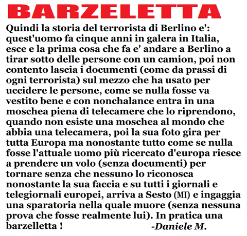 TheApologist ha scritto:Ho letto che i terroristi lasciano deliberatamente i documenti sul luogo del misfatto per far sapere a chi di dovere che il lavoro é stato portato a termine, così le "cellule" possono rivendicare l'attentato e pagare la famiglia del "martire" per il sacrificio...