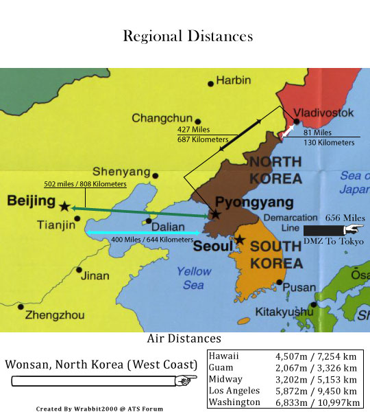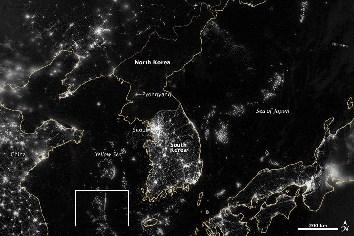 Immagine Distanze fra le capitali. Infine vediamo i due contendenti "ufficiali", in realta' pedine, vittime dei giochi disumani delle "potenze". Mentre la Propaganda di stato martella sulla pericolosita' dell'esercito del Nord questo e' stimato al ventottesimo posto, dietro la Svezia e il Vietnam. La pacifica Corea del Sud e' all'ottavo, prima di Italia, Brasile e Israele.Il sud e' ricco! Pensate al vostro telefono Samsung o alla vostra auto hyundai. Il Nord non puo' mai vincere una guerra contro il Sud, lo sanno tutti. La loro strategia risiede nel rendere la vittoria degli alleati una vittoria di Pirro. Seul si trova a soli 41 chilometri dalla linea di confine. I Nord Coreani hanno artiglieria che puo' tranquillamente radere al suolo la capitale del sud senza nemmeno muoversi. A parte questo vi e' poco che una nazione che difetta perfino di energia elettrica possa realmente fare. Non ci credete? Un immagine dice piu' di mille parole. Questa di sotto e' una foto dal satellite dell'Asia. Notate come il Nord Corea sia quasi totalmente al buio.