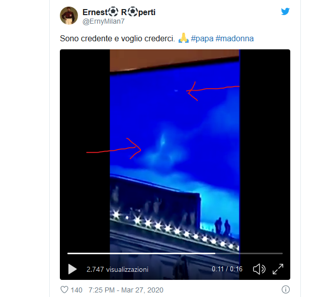 Durante la preghiera di Papa Francesco in piazza San Pietro è apparsa nel cielo una figura che non poche persone considerano essere quella della Madonna