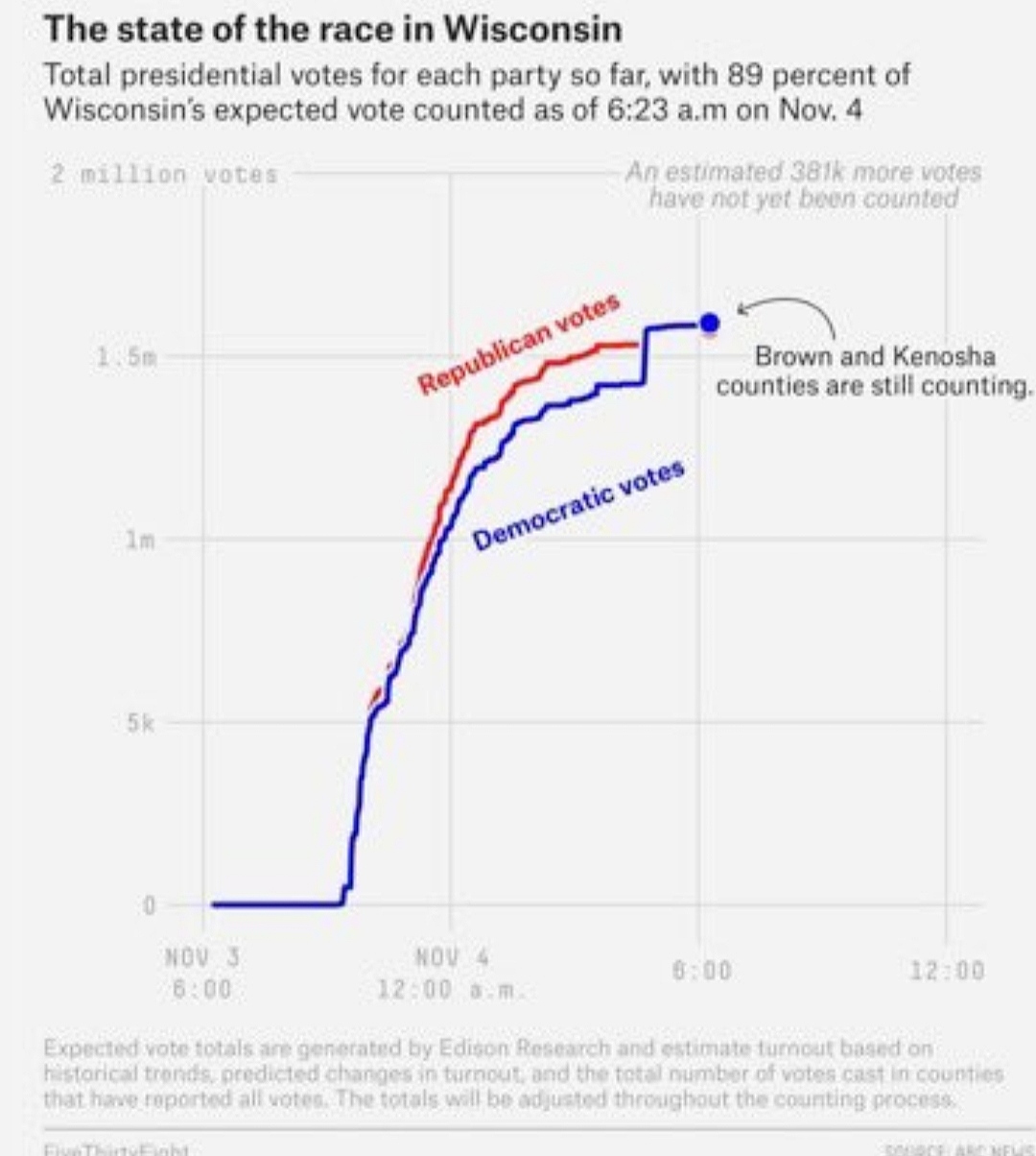 TheApologist ha scritto:Non capisco : Wisconsin, 95% di sezioni scrutinate, 49.6 Biden, 48.9 Trump, l'associated press da la vittoria a Biden.