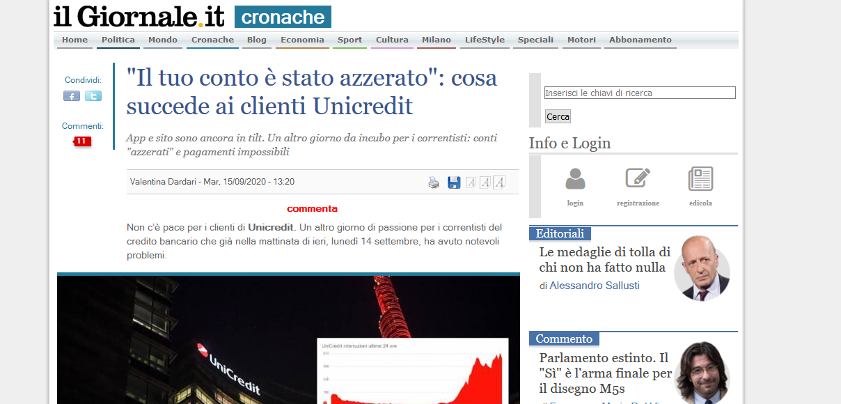Tra i vari messaggi quello di una donna che questa mattina ha cercato di pagare con la propria carta di credito il supermercato. L’importo era di 110 euro. Niente da fare. Dopo tre tentativi, alla fine ha dovuto rinunciare a qualche acquisto per scendere alla cifra che aveva disponibile in contanti. Però, come ha scritto:“Alle 11:22, dopo un’ora, mi sono arrivati sullo smartphone 3 sms di avvenuto addebito per 110 € l’uno”. Alla sua domanda di intervenire in qualche modo, le è stato risposto “di attendere qualche giorno la gestione dei problemi avvenuti da parte della Sede centrale di Unicredit”.
