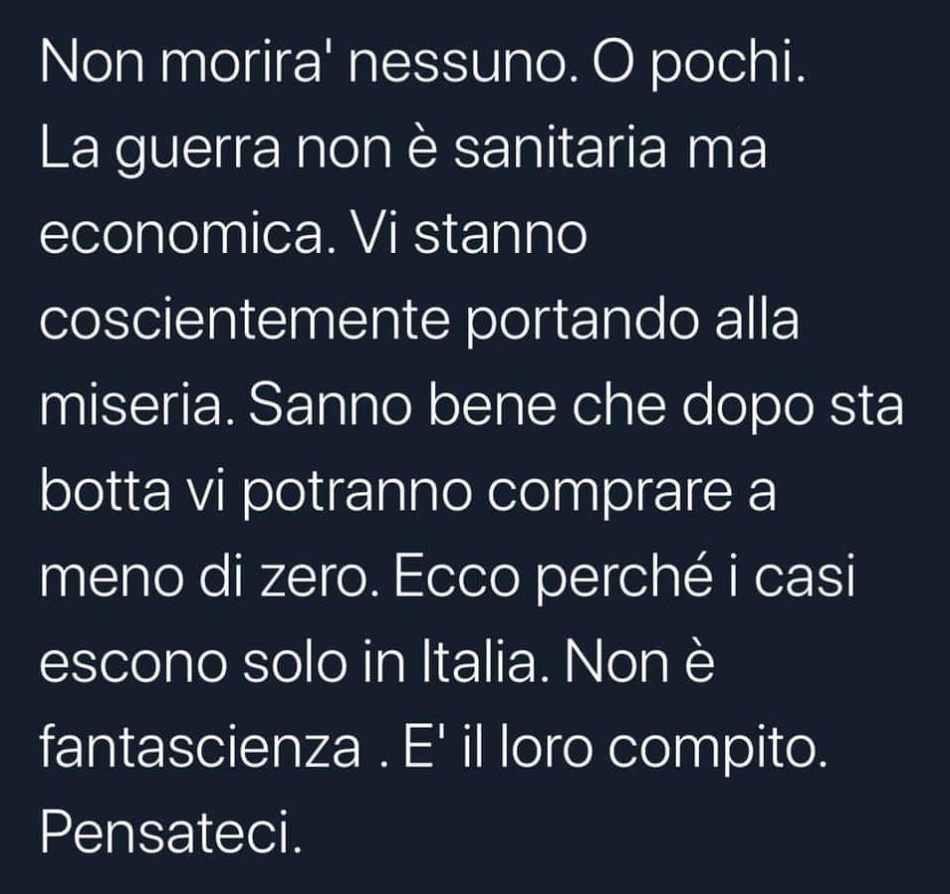 https://www.tgcom24.mediaset.it/mondo/c ... K9WhRCC2Ec13) La comparsa del coronavirus è avvenuta a Wuhan uno dei maggiori snodi ferroviari della Cina e proprio a ridosso dei festeggiamenti per il capodanno cinese (25 gennaio 2020), ovvero esattamente nell’unico periodo in cui si verificano enormi spostamenti di cinesi sia in patria che nel mondo con circa 3 miliardi di persone in movimento. Se qualcuno avesse avuto intenzione di diffondere un virus in Cina non avrebbe potuto scegliere luogo e periodo migliore