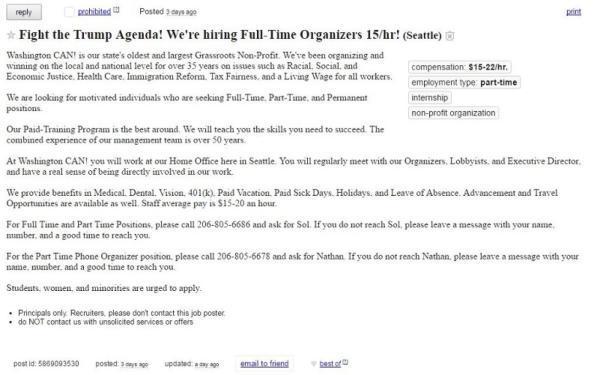 Il quotidiano americano riporta che inizialmente l'annuncio assumeva protestatori "anti Trump", ma dopo delle segnalazioni il sito di annunci online ha rimosso l'inserzione. Allora il gruppo politico l'ha ripubblicata con una piccola modifica: ora si cercano attivisti per fermare l'agenda politica del tycoon.