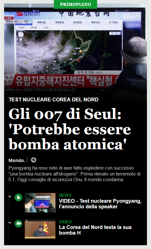 ma comunque ho letto che cè stata una scossa di assestamento sta mattina quindi qualcuno dice balle, secondo me e molti altri è stato solo un terremoto ma il tutto è stato manipolato dagli anti ciccio kim per farlo passare come test, poi è capace che kim ha cavalcato l'onda per farsi grosso agli occhi del mondo.