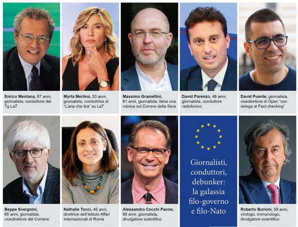 La rete propagandistica di Stato è così ramificata da coinvolgere la «quasi totalità dei giornalisti di punta che occupano le posizioni di maggior rilievo nel panorama televisivo nazionale»: da Lilli Gruber, la cui funzione sembra quella di «curare le apparenze operando una pantomima di dibattito democratico sistematicamente puntellata da spot pro-governo», a Myrta Merlino, punta di diamante del dibattito trash finalizzato alla «banalizzazione del discorso in chiave puramente emozionale e sensazionalistica», fino a David Parenzo e il suo caratteristico turpiloquio orientato al «discredito personale degli interlocutori» attraverso le tattiche della derisione e del dileggio utili a «decentrare l’attenzione del pubblico dal merito della discussione». Il materiale raccolto negli ultimi due anni da migliaia di cittadini, giornalisti e studiosi indipendenti individua altre caratteristiche fondanti della collaudata rete disinformativa, direttamente mutuate dalle 11 tattiche di propaganda di Joseph Goebbels, in particolare, si legge nel rapporto: il «principio del silenzio», che consiste nel «nascondere le notizie che favoriscono l’avversario», e quello cosiddetto «della verosimiglianza», cioè la presentazione di informazioni apparentemente confermate da fonti solide (lo dice la scienza), ma in realtà esposte in modo parziale». In questo scenario si distingue anche Beppe Severgnini, giornalista e vicedirettore del Corriere della Sera, che in un monologo dai toni marcatamente didattici si rivolge al Governo: «bisogna fare da subito un discorso chiaro. Decida per chi è obbligatorio il vaccino e poi tiri dritto», d’altronde quelli che rifiutano il vaccino anti Covid-19 «possono permettersi certe fantasie perché vivono in una società vaccinata».