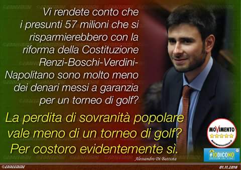 Nel comitato organizzatore della Ryder Cup c'è il figlio di Gianni Letta (ex-sottosegretario di Berlusconi) e anche la moglie di Frattini (ex-ministro esteri di Berlusconi). In questi giorni i denari pubblici dovrebbero essere maneggiati con particolare attenzione viste le emergenze che deve affrontare il Paese. Vi invito poi ad una riflessione. Vi rendete conto che i presunti 57 milioni che si risparmierebbero con la riforma della Costituzione Renzi-Boschi-Verdini-Napolitano sono molto meno dei denari messi a garanzia per un torneo di golf? La perdita di sovranità popolare vale meno di un torneo di golf? Per costoro evidentemente sì. #IoDicoNo
