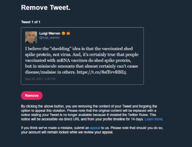 Twitter ha recentemente sospeso l'account di Luigi Warren, apparentemente per aver violato le Regole di Twitter. Il tweet ora penalizzato di Warren esprimeva le sue opinioni sul fatto che la proteina spike venga rilasciata da persone vaccinate con vaccini mRNA.