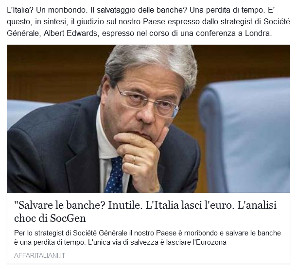 Zero Hedge rilancia un articolo sul disastro economico dell’Italia, commentando le parole dell’investitore francese Charles Gave. Mentre tutti gli occhi sono puntati sull’imminente fallimento di Monte dei Paschi e il conseguente collasso del sistema bancario, l’articolo nota una semplice verità: tutto questo è l’ovvio sintomo di un’economia la cui competitività è stata distrutta da un tasso di cambio artificialmente fisso (l’euro). Un investitore avveduto non punterebbe nulla sull’Italia in questo momento. Eppure, prima della moneta unica e per decenni ininterrotti, l’economia italiana aveva saputo correre ben più di quella tedesca.