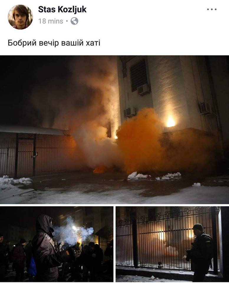 Fuoco e fiamme, ora, di fronte all'ambasciata Russa a Kiev.