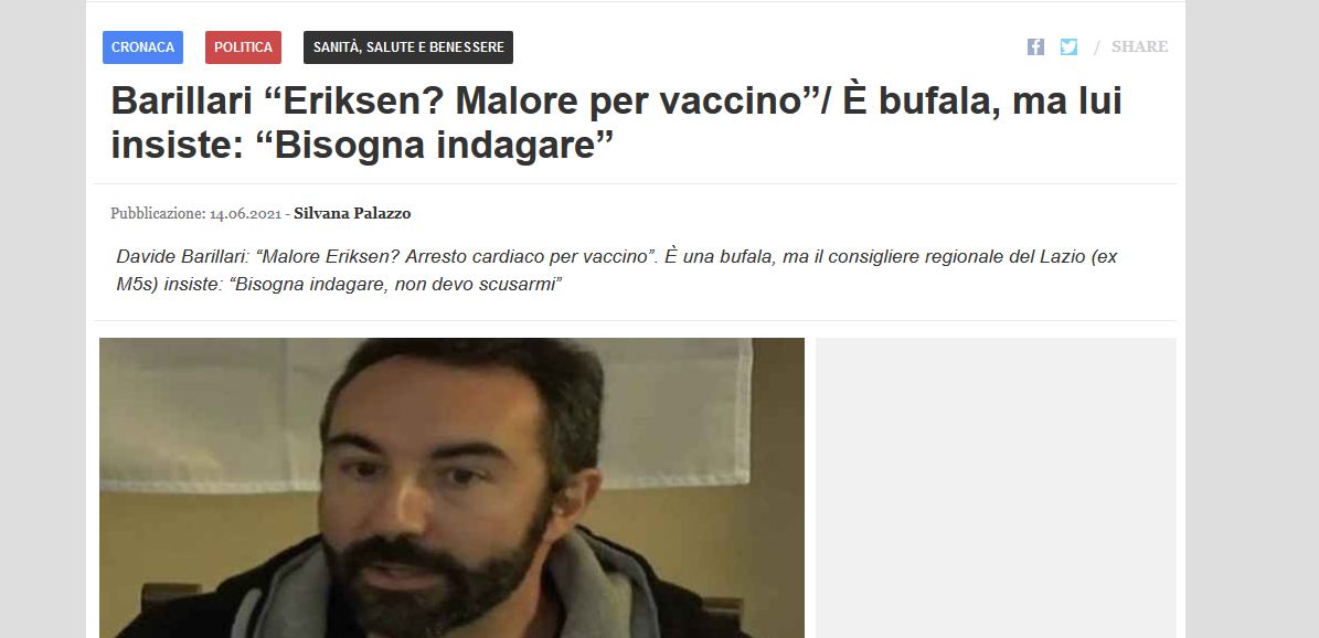 Ma Davide Barillari non fa marcia indietro riguardo il tweet in cui associava il vaccino anti Covid al malore di Christian Eriksen ad Euro 2020. “Se tornassi indietro rifarei il post, non mi devo scusare di nulla”, dichiara all’AdnKronos. Inoltre, evidenzia che il tema è un altro, per giunta più grande: “Non è il calciatore ma le reazioni avverse. Il punto è questo”. Per il consigliere regionale del Lazio non c’è motivo di vergognarsi: “Io non ho la verità assoluta. Ma dico che bisogna investigare. E ciò non vuol dire fare sciacallaggio. Non ci sono certezze”. Aggiunge pure che tutti i calciatori che partecipano agli Europei sono vaccinati, peccato che non sia così. “Questo di Eriksen è uno dei tanti casi in cui non c’è chiarezza né voglia di approfondire. Confermo che ci sono morti e reazioni avverse, paralisi, trombosi di persone a seguito del vaccino, i numeri sono alti. Vorrei che si indagasse per capire cosa succede”. Barillari, dunque, chiede trasparenza. Secondo l’ex M5s, aveva scritto il tweet “per avere informazioni che non mi stanno dando”.