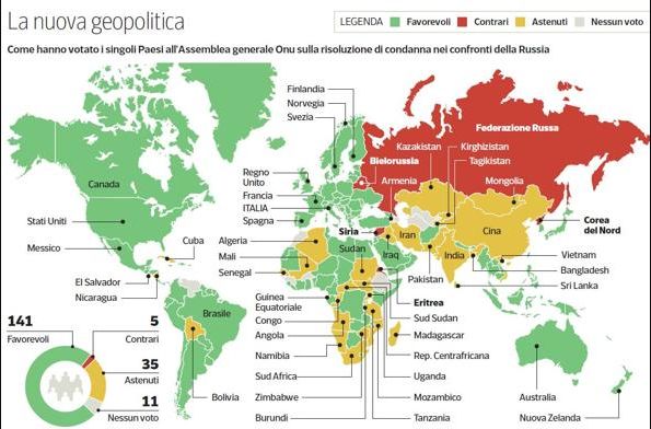 Ecco come hanno votato i paesi membri, riguardo alla risoluzione ONU, che condanna l'intervento Russo in suolo Ucraino: